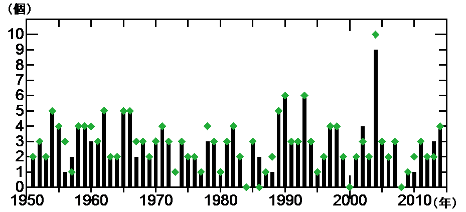 | 図4:年別台風上陸数(1951年〜2014年)(棒グラフ:本研究、菱形:気象庁) |