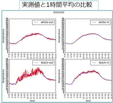 快晴日である10月20日4種類の測定温度の1時間移動平均を取ることにより、測定温度の変化をとらえることができた。その上下関係は、黒色百葉箱の内側>黒色百葉箱の外側>白色百葉箱の外側≒白色百葉箱の内側の順で測定温度が高いという結果が得られた。