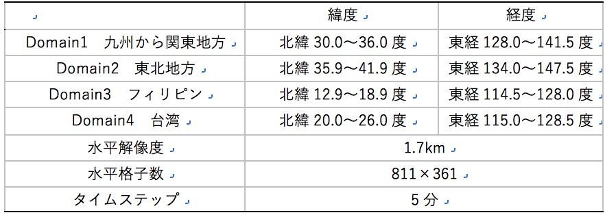 大気データ(Domain2を)をインプットデータとして、気象庁が用いている高潮モデル(JMA Storm Surge Model)を用いてシミュレーションした。高潮モデルの計算設定を表2にまとめた。水平格子数は811×361で固定し、作成した4つの海底地形を図1に示す。本研究では、吸い上げ効果と吹き寄せ効果のみを計算し高潮偏差の算出を行っている。なお、本研究では、天文潮位は含めず、浸水は考慮していない。