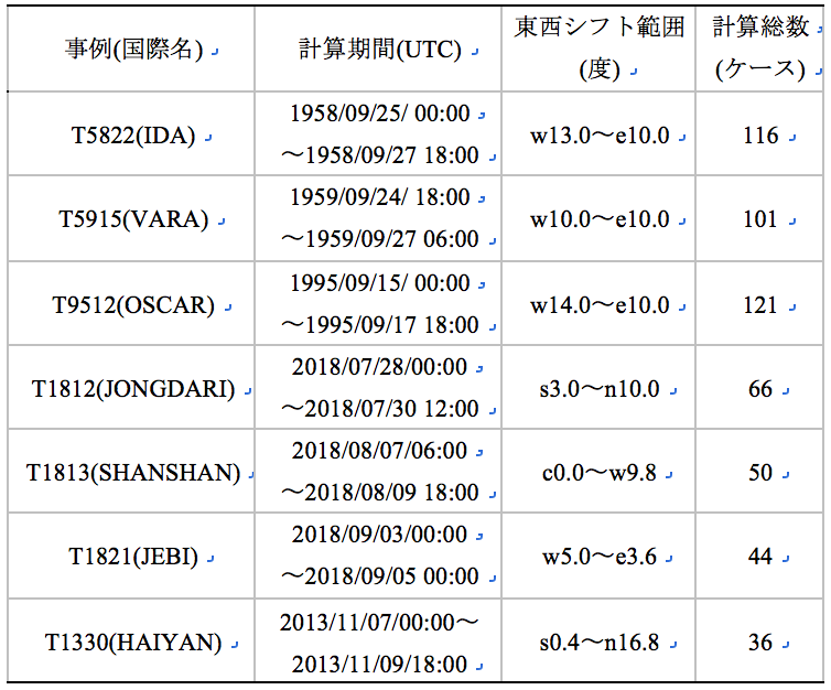 本研究で対象とした台風事例は、T5915 、T5822、T9512、T1812、T1813、T1821、T1330である。各台風事例について、台風経路アンサンブルシミュレーションする上での関連事項を表3にまとめた。各台風の事例は36から121ケースを計算した。