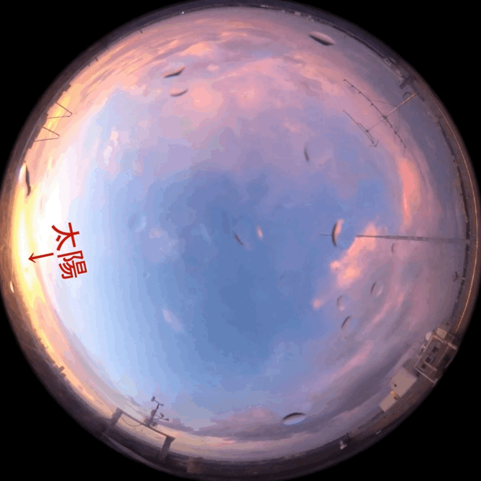 2.1)空を定常的にカメラで撮影する。 撮影には、広角で撮影ができる魚眼レンズカメラ(CASIOのEXILIM EX-FR200)を用いた。 撮影した画像は、カメラが上を見上げた形になり、地図とは異なり右側に西、左側に東が写る。図1 魚眼レンズカメラと撮影した画像 撮影は計160日間、場所は4月~8月は川崎市、9月から現在までは横浜国立大学第二研究棟で撮影をした。 画像の撮影する間隔は30秒と設定し、タイムラプスでの撮影をした。 2.2)撮影した画像をつなぎ合わせて動画にする。 撮影した画像をつなぎ合わせて動画にする → 動画編集ソフト(Video Studio) 気象現象の解説のスライドを作成する → Power Point を用いて編集した。