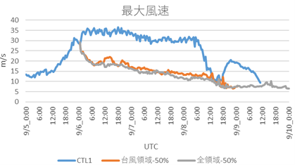 図4.最大風速の変化(水分量の減少)(制御時刻2019/9/6/00UTC)