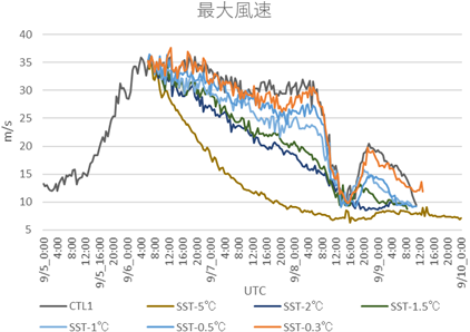 図5.最大風速の変化(海表面の冷却)(制御開始時刻2019/9/6/06UTC)