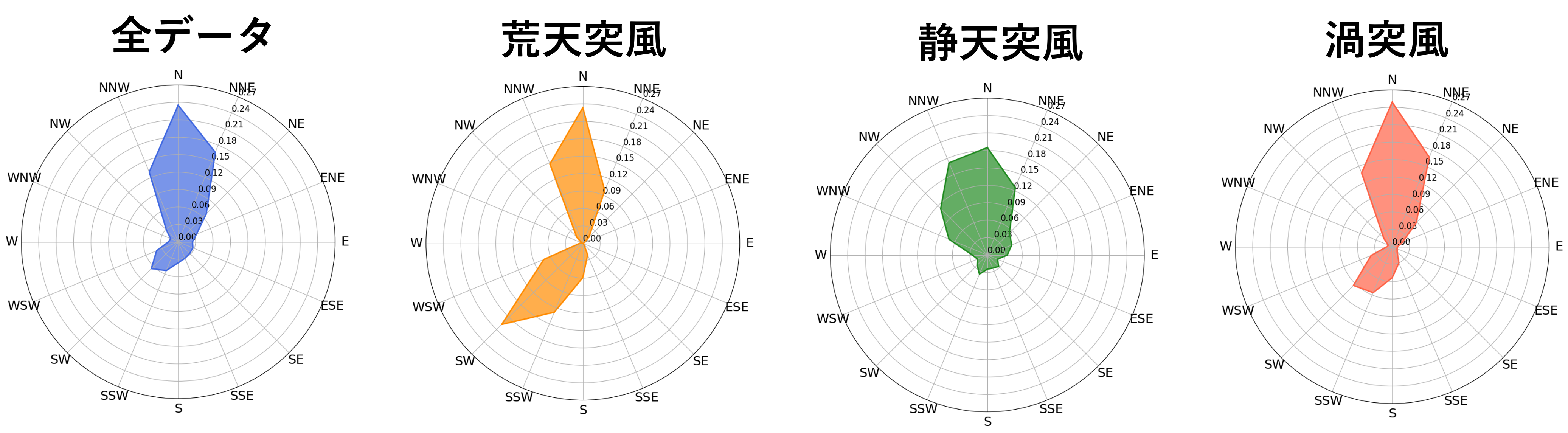 最も平均鉛直風速が強かった荒天突風は、全データの風配図と比較して、南寄りの風が増加していたことがわかった。