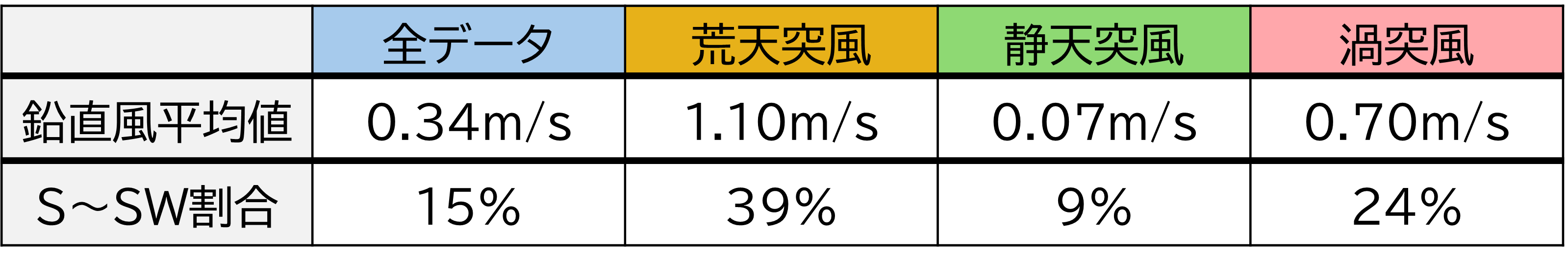 南寄りの風(南~南西)の出現頻度が多い順に突風時の上昇流が強まっていることがわかった。