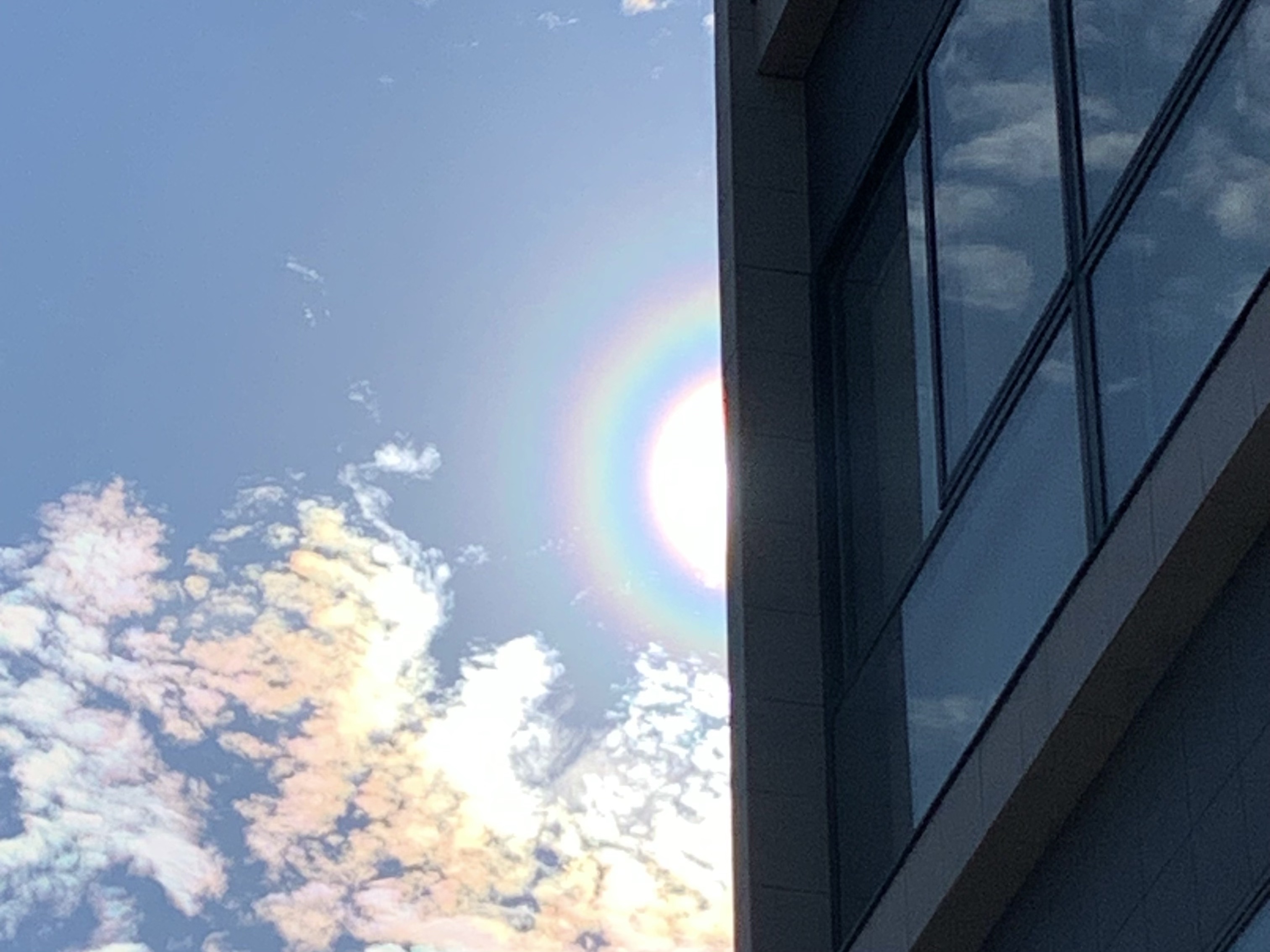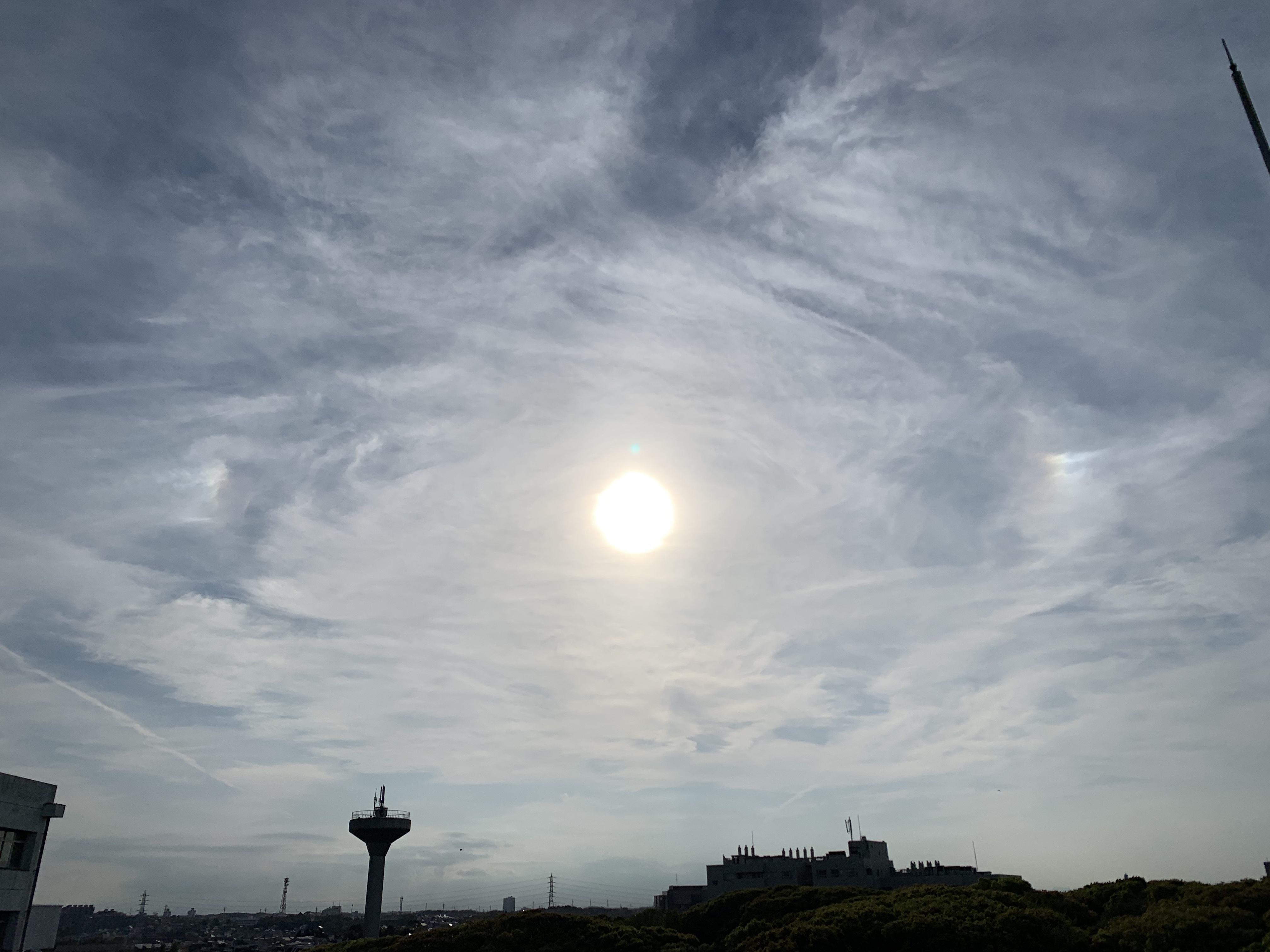 花粉光環と彩雲です。 | 駅のホームで見つけた花粉光環です。 | この日は花粉の量がものすごいとニュースで流れていました。ニュースを見て外に出てみたら案の定見れました。 |