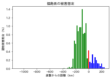 伊勢湾台風をモデルとした風による被災建物想定(図2と図3) によると、福島市への直撃から100 km西の経路の台風(図4)で、福島県では被害を受ける建物数が最も大きくなり、この時約15000棟(全建物数の約1 %)の建物に被害が及ぶと予測される。直撃から西に380 km、東に240kmの幅620kmにおいて、建物の被害が100棟以上でると予測されている。