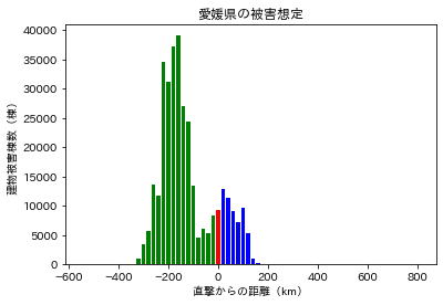 伊勢湾台風をモデルとした風による被災建物想定(図2と図3)によると、松山市への直撃から160 km西の経路の台風(図4)で、愛媛県では被害を受ける建物数が最も大きくなり、この時約40000棟(全建物数の約5 %)の建物に被害が及ぶと予測される。直撃から西に320km、東に160kmの幅480 kmにおいて、建物の被害が100棟以上でると予測されている。
