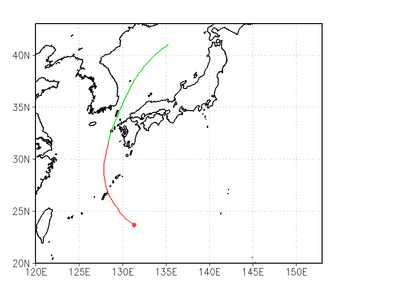 台風ノモグラム(図1)では、福岡県福岡市城南区からみて東の中国地方西部、西の近海に台風が位置する時に、福岡県福岡市城南区にとって最も風のリスクが大きくなると予測される。